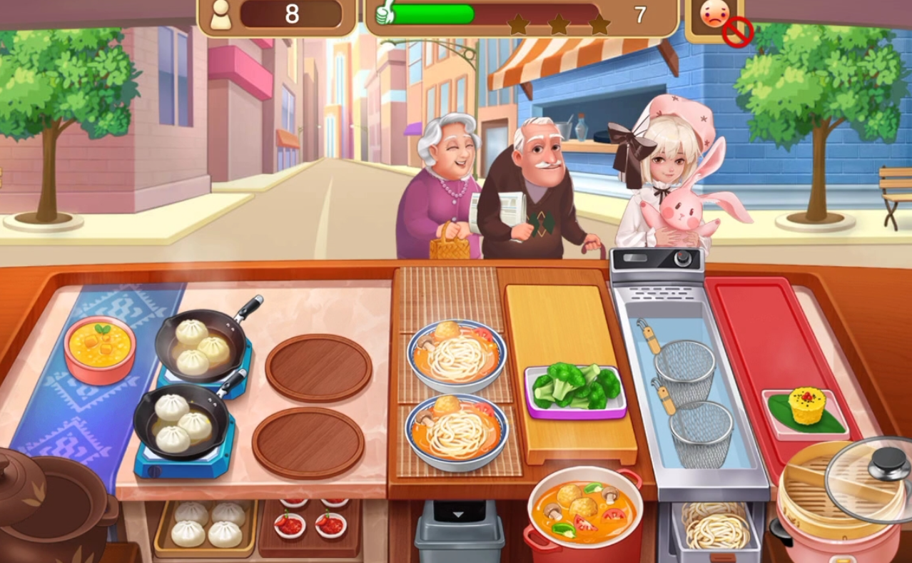 首先小伙伴们可以在“进入早高峰”这几个字出现之后,就立刻点击屏幕上的食物,将可以烹饪的东西先烹饪起来,这样当客人来的时候就不至于手忙脚乱。当然仔细的观察也是十分必要的,因为每一位客人提出的要求都可能会有一些细微的不同,因此小伙伴们也不要先急着做出成品,以免没有客人需要,导致了浪费时间。