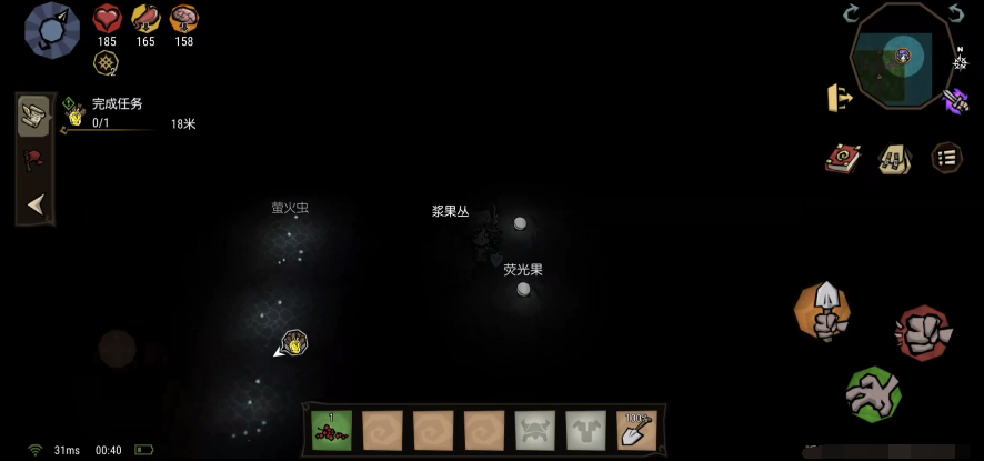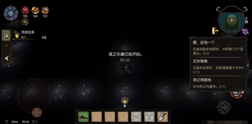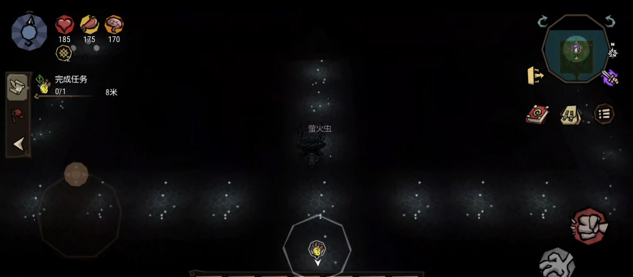 进入关卡后先往上走,路上会有萤火虫照亮你的路,这时先不用担心san值,会看到一个火鸡神龛,这里是一个十字路口,记住神龛的位置在路口的下方。往左走,继续沿着萤火虫的路走会看到一些荧光果可以拾取它们,它们可以提高san值,也可以用来照明,一共需要拾取三个荧光果切记不要全吃掉。那完全部的讲过之后回到十字路口,往下走回到火鸡神龛,把两个浆果丛物品放入神龛,完成任务。