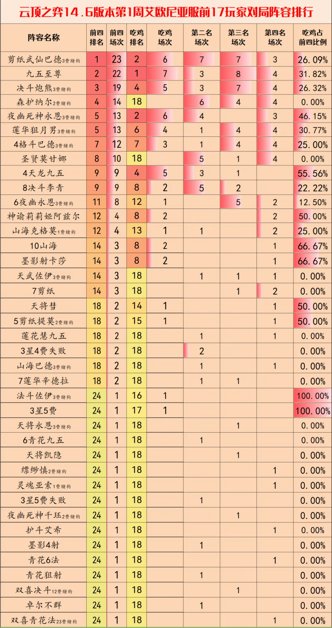剪纸武仙巴德这周统计中吃分场次23场,吃分排名第1名,吃鸡场次6场,吃鸡排名第2名。阵容吃鸡占前四占比例26.09%。