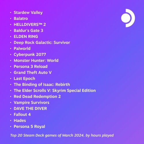 以上,便是小编收集到的有关SteamDeck公布3月热玩榜的全部内容,感兴趣的朋友们可以关注一下,那么,让我们下期再见。