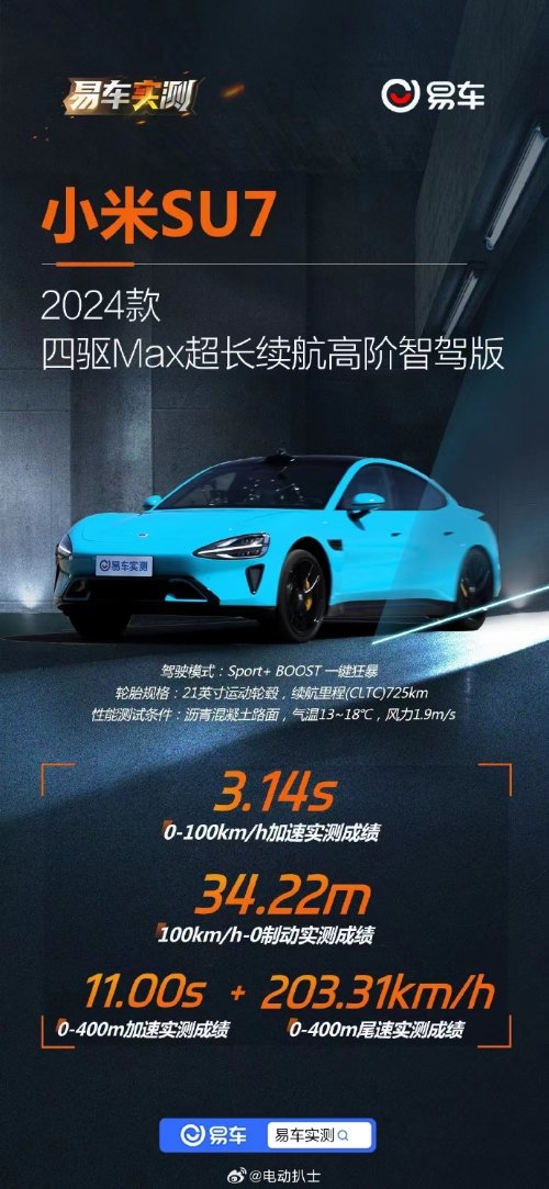 据了解,小米SU7官方零百加速成绩2.78s,但易车、汽车之家和懂车帝App官方微博三家垂媒的测试成绩均超过3s。