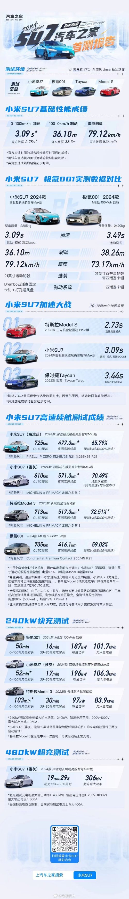 而且,小米汽车一同展示了媒体实测,小米SU7 Max 零百加速实测3.09s(官方2.78s),同场地特斯拉Model S Plaid实测2.73s(官方2.1s),保时捷Taycan Turbo 2022款实测3.44s(官方3.2s,含起步时间),等车型的实测和官方成绩对比。