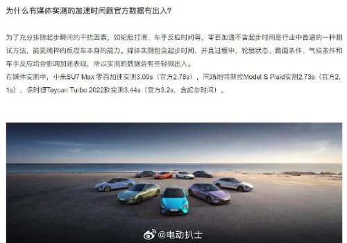 小米SU7上市后,多家媒体对SU7 MAX版进行了性能测试,但测试出来的数据却和小米汽车的官方数据有所出入,对此,小米汽车在其官方微博答网友问 (第二集)中回应了这一问题,小米认为,零百加速不含起步时间是行业中普遍的一种测试方法,能更纯粹的反应车本身的能力。媒体实测包含起步时间,并且过程中,轮胎状态、路面条件、气候条件和车手反应均会影响加速表现”。