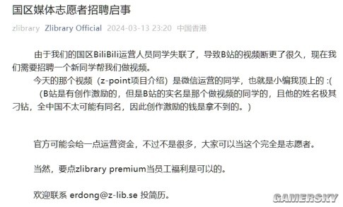 事件的起因要追溯到上个月13号,Z-Library官方微信发布的一则平平无奇的简短声明。在公告中,他们表示自己的B站运营“失联”了,想要招聘一个新的B站运营。