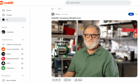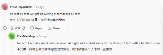 此前,V社老板G胖的近照最近被曝光出来,可以看出,G胖于以前相比瘦了不少,同时,该话题也迅速登上了Reddit热门榜第1名,网友们的评论十分逆天,网友纷纷在热评下盖楼争夺自己的“择偶权”:“他看起来不错”,“他是我的!”。也有网友调侃,可能是因为之前亲自上门送货(SteamDeck),这让他变瘦了。有人对此回复表示:是我晚上偷偷溜进他的房间,用竹吸管吸出了他的脂肪。