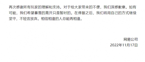 在最新的公告当中,“当服务器开启时,我们将保证您的账号数据被完整保留”这一条,也表明网易的确做到了当初的承诺。在即将停止运行时发布的那封《致暴雪玩家的一封信》中表示:商业的归商业,游戏的归游戏,重视玩家的呼声,珍视玩家为游戏付出的一切,妥善保护大家的游戏资产和记忆。