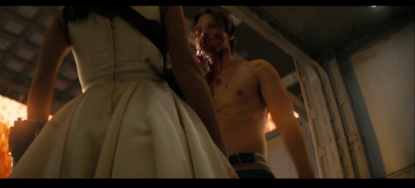 发现被骗了的露西和新郎开启了二番战,拳拳到肉的那种。男人用刀子捅进露西肚子,露西抄起一旁的花瓶,用玻璃扎进了男人的脖子。