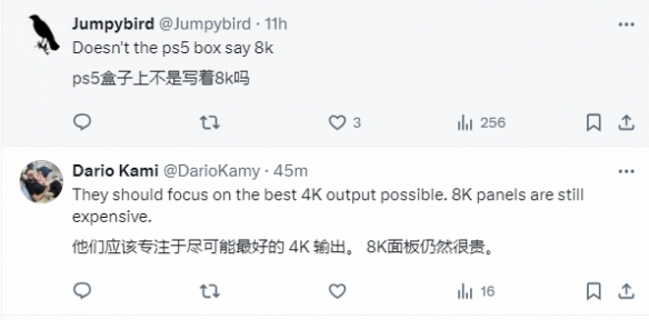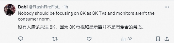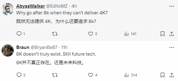 有人直接表示:“都无法提供4K,为什么还要追求8K?”显然,8K对于玩家来说还是有些太遥远了。“8K并不真正存在,还是未来科技。”“这是给拥有8K电视的2%用户出的。”