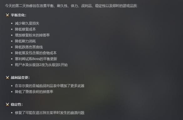 不过值得一提的是,在最新的补丁发布后,每次死亡后的装备耐久度损失以及修复装备的成本已经大幅度下降,游戏体验和以往相比有了一定的改善,但必须收集食材做饭回血这个设计层面的弊病却并没能改变太多。