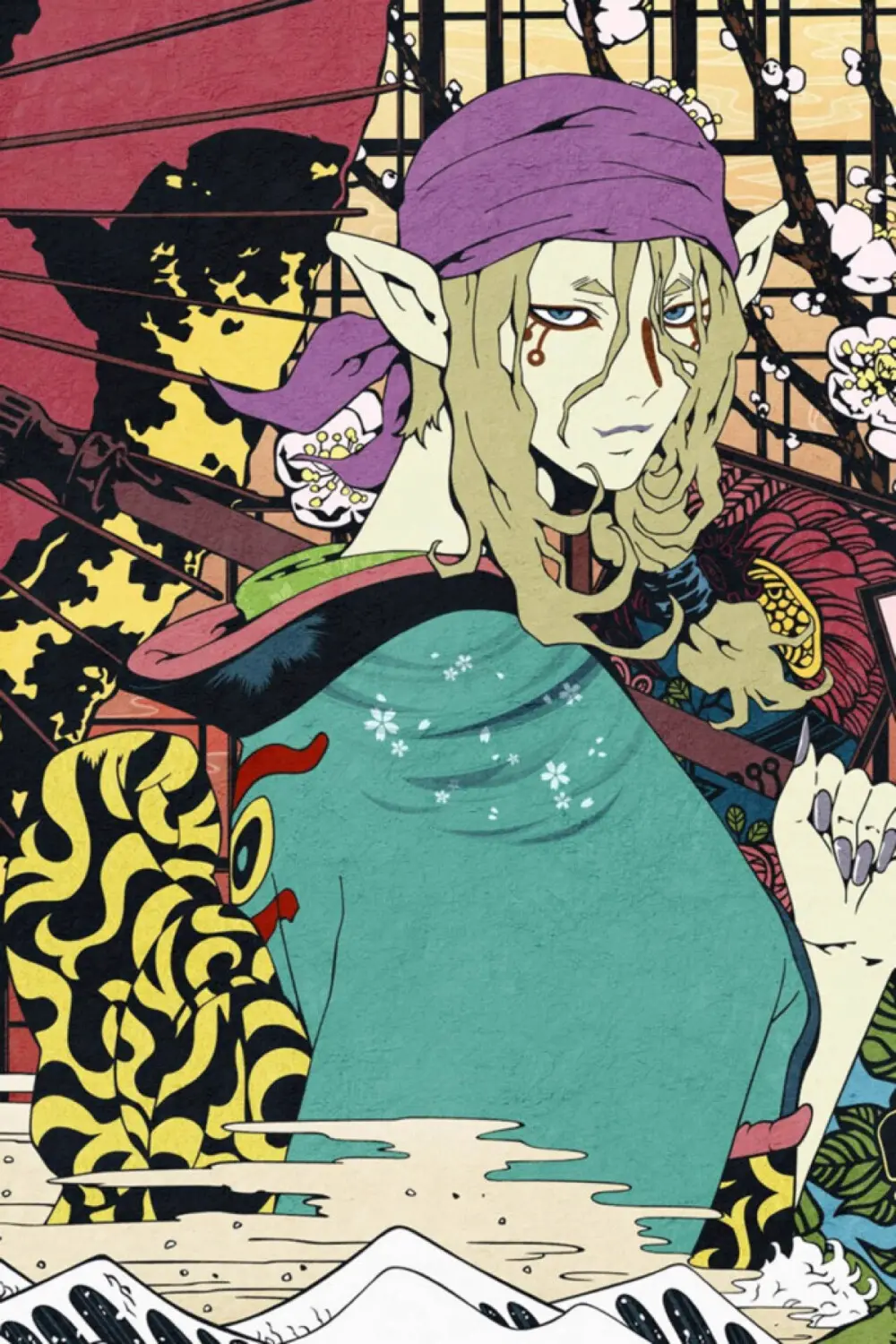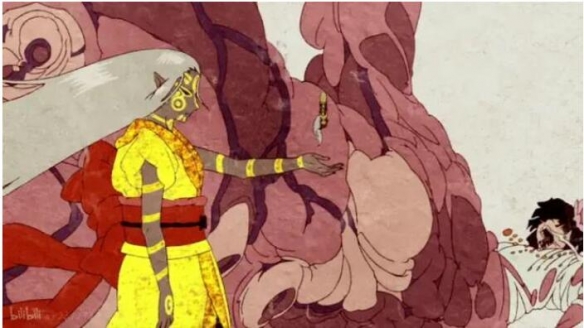 动画中海坊主篇的墙纸图案让人联想到奥地利画家克里姆特的作品,金色与几何图形的运用,装饰感十足。《鵺篇》中飞溅的血液犹如抽象表现主义画家杰克逊·波洛克的泼墨画,充满了张力和动感。