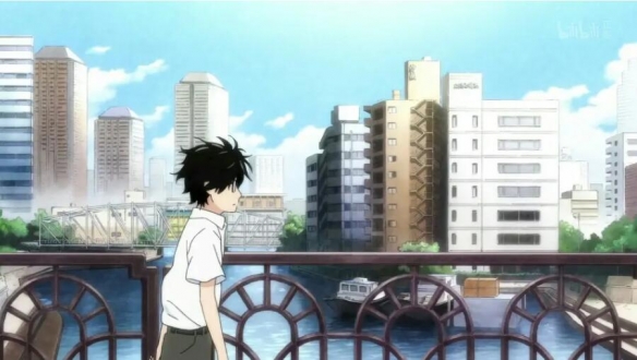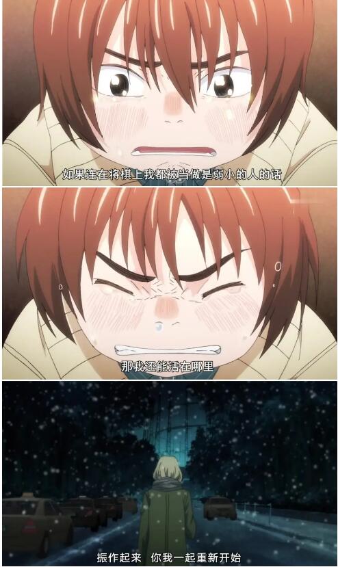 另一个刻画得非常出色的角色,就是男主角桐山零。整部作品大多以桐山零的第一人称视角展开,频繁穿插着他的回忆片段,对他的内心活动也有着大量细致入微的刻画。桐山零的童年同样悲惨,他自幼丧失双亲,为了逃避孤儿院的命运,不得不谎称自己喜欢将棋,才得以被养父收留。而这个善意的谎言,却成为了香子悲剧的源头。在决心离开养父家自立门户后,桐山零邂逅了改变他一生的三姐妹。种种的巧合造就了桐山零的人生轨迹,他是天赋惊人的将棋选手,中学时期就已经崭露头角,但同时也承受着巨大的压力;他也是一个沉默寡言的文静少年,内心的波澜远胜于表面的平静,这使得他在爆发情感时,往往有着更加震撼人心的力量。