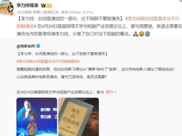 本期小编根据观察者网报道,在4月24日首届网络文学与短剧产业发展论坛上,曾与周星驰、吴孟达等著名演员合作的香港导演李力持,分享了自己对当下短剧的看法。接下来我们就一起往下看看吧。