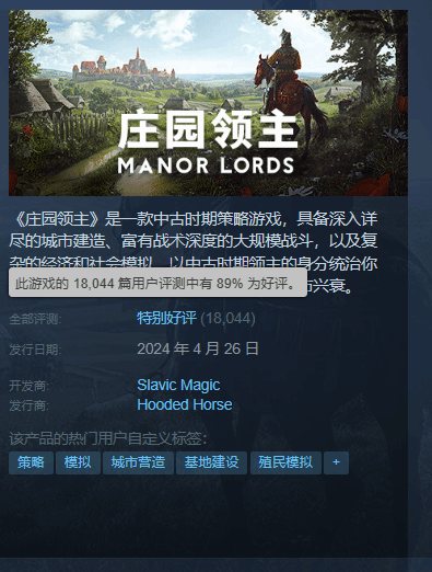 本期小编和大家一起聊聊城市建造游戏《庄园领主》,这款游戏已经发售三天,而本作的Steam评价目前从“好评如潮”降至“特别好评”,在18044位用户评价中,好评率为89%。具体内容我们就一起往下看看吧。