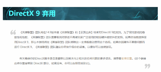 玩家若因硬件不兼容问题而运行DirectX 9,《英雄联盟》团队建议尽快升级设备,以便可以继续游玩。