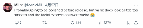 不过,似乎很多粉丝,认为祖国人的角色模型看起来不太对劲,有人指出他的脸部太过光滑且面部动画很奇怪。还有用户例如X_AZEEZ3嘲笑了祖国人脸部的抽搐。