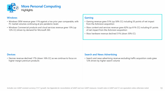 据相关消息,微软于此前发布了新一期的季度财报,而据财报显示,微软在整体游戏业务中的收入增长了51%,其中55个点的净影响归功于动视暴雪,而在在Xbox业务中,其内容和服务的收入同比增长62%,微软在财报中将61个点的净影响同样归功于动视暴雪。在Xbox硬件方面,微软表示其收入同比下降了31%。