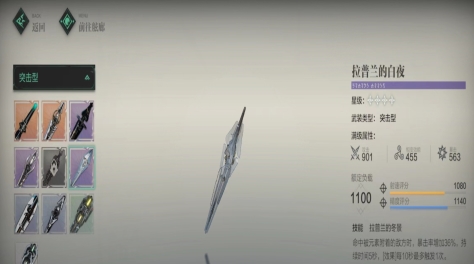 拉普兰的白夜是一款性价比较高,也相对容易获得的高级武器了,它拥有1100的额定负载,455的相变效能以及563的暴击基础属性,1080的射速以及1140的精度评估让它偏向于精度射击战术。就额定负载这个数值很平均,只有少数特殊的装备不是这个负载,相变效能也是中规中矩,既不特别出彩,也不属于短板,但是563的暴击属性可以说是冠绝群雄,在四星级的武器中实属罕见,估计因此它被分在突击类型的武器之中。