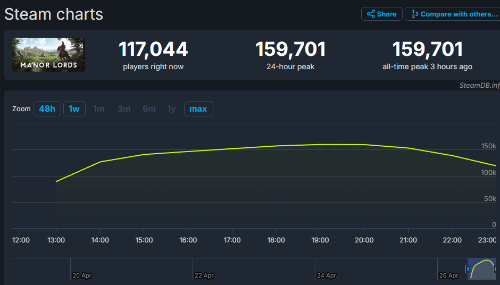 据Steamdb数据显示,截至发稿,《庄园领主》发售约十个小时,Steam峰值在线人数已经达到了15万9701人,这一数字预计会在周末继续上涨。