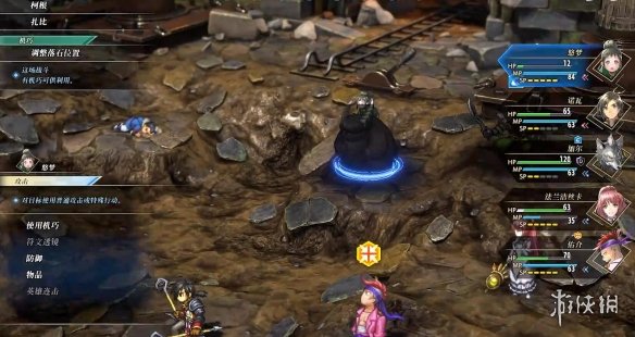 举个例子,这里上图中是游戏中的主线——柯根将军之战,柯根将军每隔一个回合,会用起重机拉出一块石头来对玩家造成AOE伤害。而相对的,玩家也可以利用本场战斗中的机巧,去改变起重机的石头落点,从而打击柯根将军(让他搬起石头砸自己的脚)。