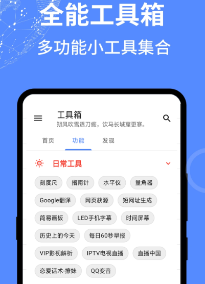 人们纷纷推荐的全能型工具箱,将效率至上的服务放在首位推送出一系列相关功能,包括工具类,办公类等体积小巧。又强大,提供文字图片处理计算查询,物体测量,身高测量等使用功能。使用该app无需下载多款应用,让设备更加纯净。