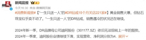 本期小编据新闻晨报报道,黄金销售火爆,但钻石珠宝似乎卖不动了。“一生只送一人”的DR钻戒,销售遇冷的状况还在继续。具体内容我们就一起往下看看吧。
