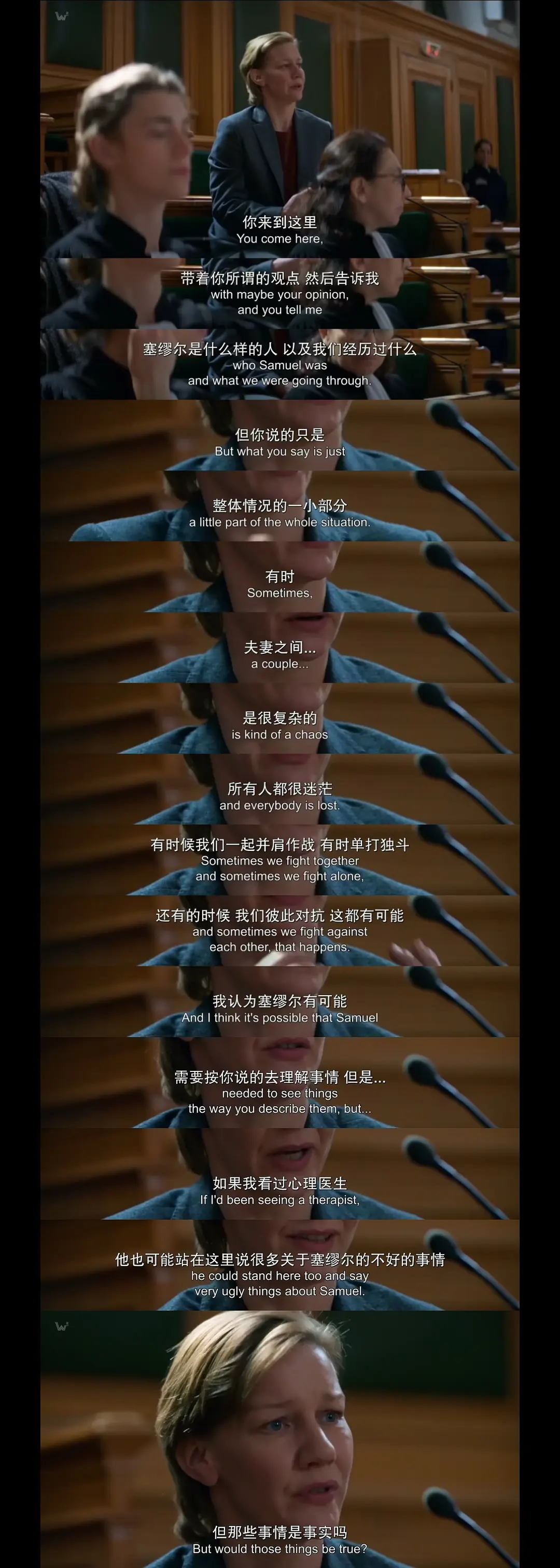 在Samuel向Sandra抱怨时间不够,希望她多带娃却遭到拒绝后,他的情绪开始变得激动。Sandra走到丈夫身边安抚他,并用温和平静的语气对他说着什么,即使在法庭上面对关键审判,她大部分时候也是如此镇定。