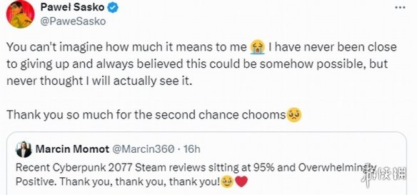 CDPR社区经理马辛·莫莫特(Marcin Momot)发推文称:“《赛博朋克2077》最近的Steam好评率高达95%,获得好评如潮的评价。谢谢你们,谢谢你们,谢谢你们!”《赛博朋克2077》首席设计师帕维尔·萨斯科(Pavel Sasko)也发文感谢了玩家支持,他表示:“你们无法想象这对我来说有多重要。我从未想过放弃,也一直相信这是可能实现的,但从未想过我真的会看到这一天。非常感谢你们给了我第二次机会。”