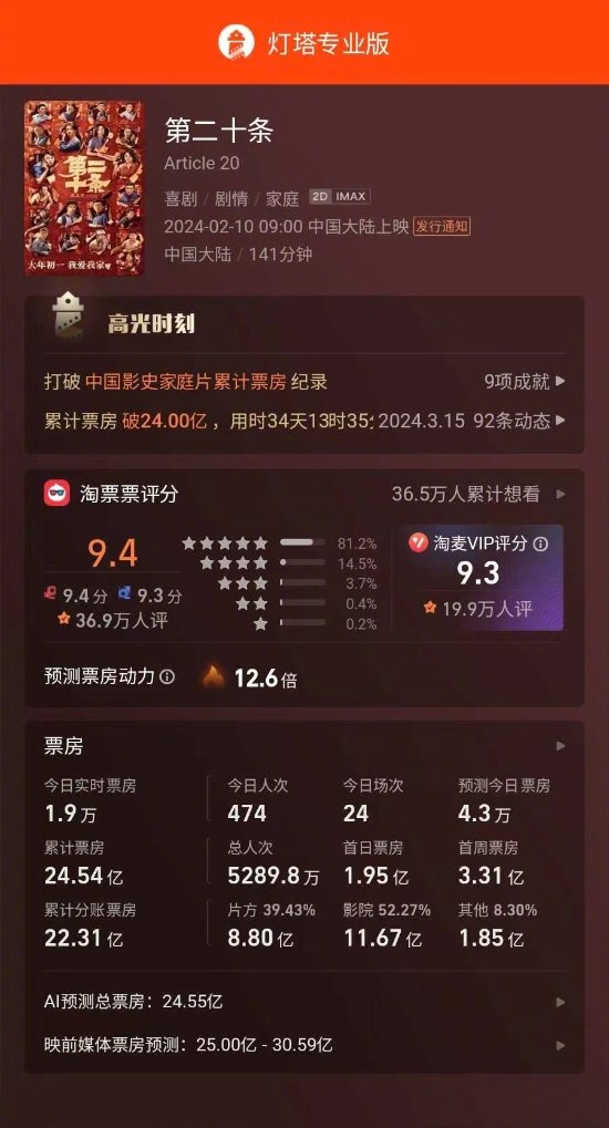 数据显示,《第二十条》打破了中国影史家庭片累计票房记录、单日票房纪录、首映日票房纪录等;打破过去三年家庭片预售票房纪录。