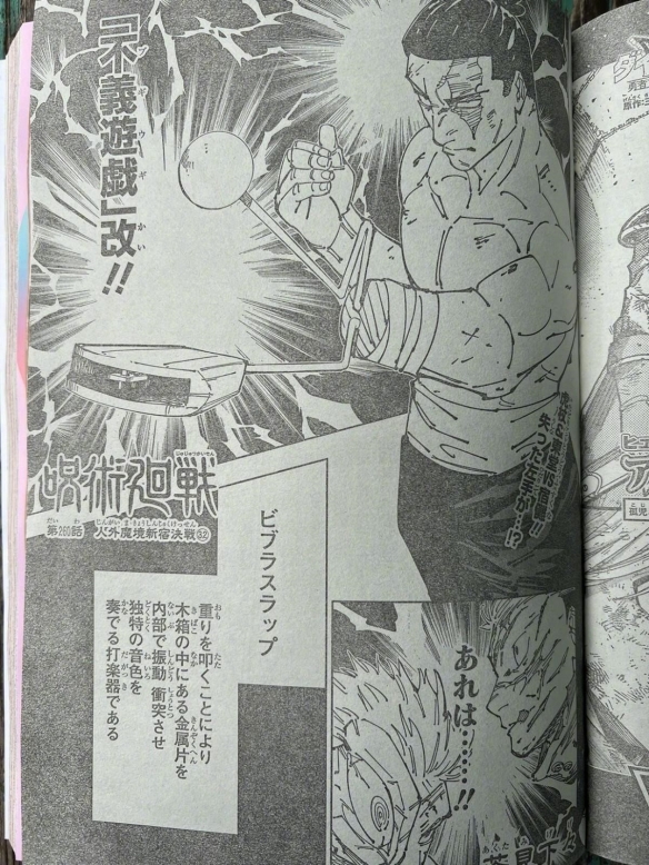 东堂的义手「不义游戏·改」。发动条件变成金属片和木箱敲击 1秒可交换50次,立下束缚后术式可以选择多个对象,这是经过乙骨辅助完成的调整。