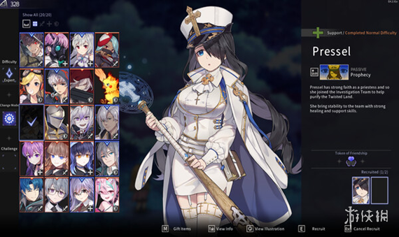 截至目前为止,共有20名调查员参与到了露西的冒险中,露西在每次出发前都可以挑选2名同伴开始冒险,并在途中获得剩下两名同伴来组成一支完整的4人小队,这构成了本作中的RPG元素,每名调查员各自在队伍中扮演不同的角色,分工明确,例如负责嘲讽承受伤害的【链锯小姐】,负责治疗的【普瑞斯特】大姐姐,就像是RPG游戏中经典的战法牧组合。