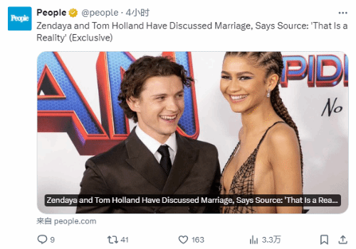 据相关消息,《人物》杂志于4月26日独家报道表示,有消息人士向媒体透露,汤姆·霍兰德和赞达亚已经就订婚事宜进行了讨论,据悉,汤姆·霍兰德和赞达亚相识于拍摄漫威电影《蜘蛛侠》期间,从那时起,他们戏外的恋情大部分都是保密的。霍兰德于2021年11月首次公开承认了他们的关系。