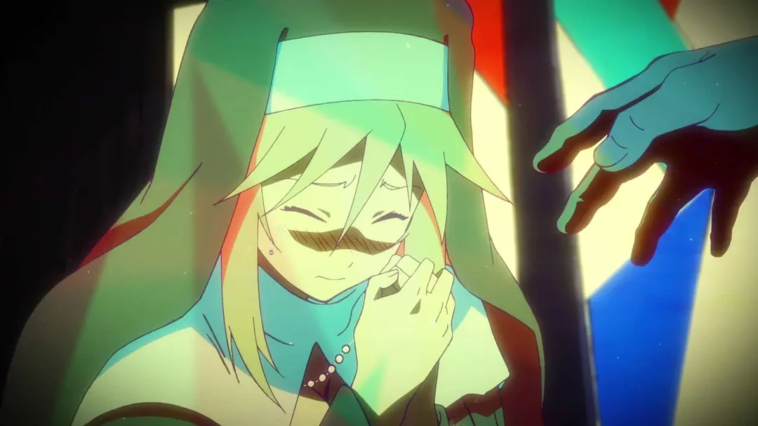 譬如,在士兵强奸修女的场景中,画面中的一切都被简化成了色块,而背景则由教堂的花窗玻璃变成了色块的堆积。这种处理手法让本应残酷而具有成人意味的一系列行为,变得宛如儿童游戏一般,在制造出荒诞感的同时,也消解了"宗教"、"神"等概念原有的严肃感,进而引发观众与修女一起对其产生疑惑和质疑。