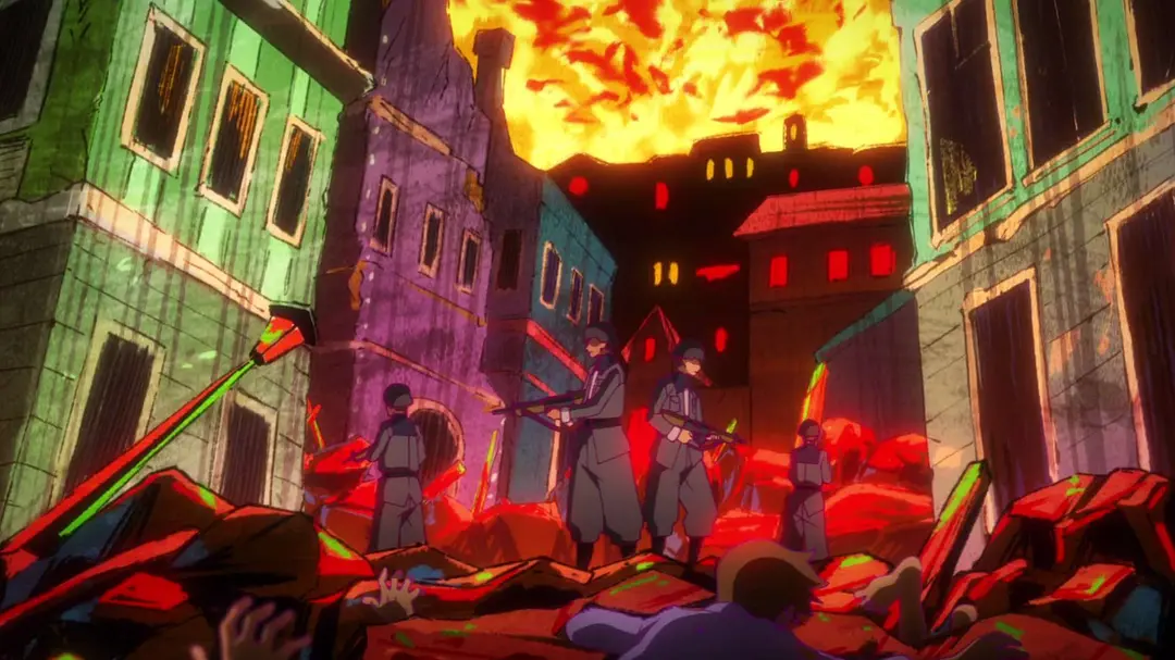 在这部动画的第一集结尾,创作者以一种极其抽象且略带喜剧色彩的方式,生动地描绘了现实世界中令人发指的侵略战争和性暴力。