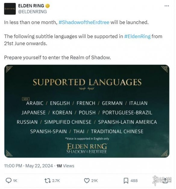 本期小编和大家聊聊开发商FromSoftware今日(5月23日)确认:《艾尔登法环》“黄金树之影”DLC首发将会支持15种字幕语言的消息,除了基础版游戏中曾经支持的英语、法语、波兰语、韩语、葡萄牙语(巴西)、日语等等。新DLC还新增了阿拉伯语的字幕选项。那么接下来我们就一起往下看看吧。