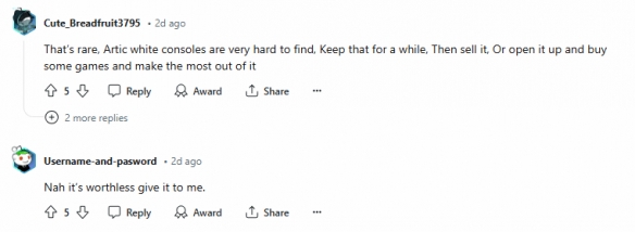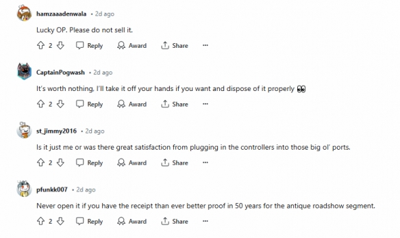 这位玩家同时还在帖子中询问了它的价值。在评论区中,有玩家表示这台主机的价值现在非常可观,更不用说它还保持在全新未拆封的形态。更多玩家则纷纷表示应该将这台主机继续保存,这样它就会更值钱。