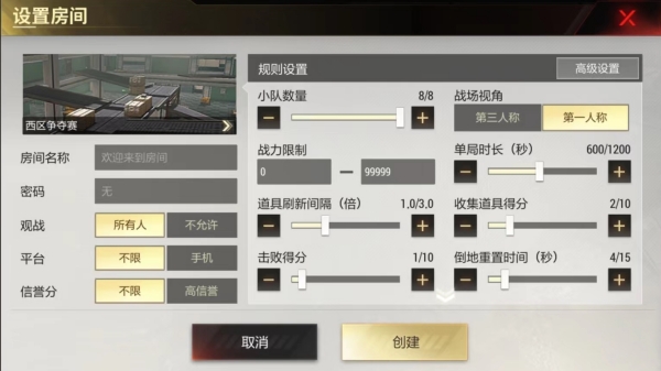 该设置主要是一些比较基础的设置,例如设定视角(第三人称或第一人称)、队伍数量(关系到房间玩家总数)、道具刷新、时长等,若玩家只想来一场标准对局,那么直接点击创建即可。可若是玩家对房间有一些其它的想法,则可以按标签进行更改。