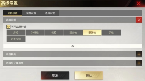 此外,在高级设置中,玩家可对房间的游戏模型进行更具体的规划,例如规定房间只能用步枪或狙击枪等,甚至还可以具体到武器的型号以及配件属性等。所以玩家若是想让游戏变得更具娱乐性,可在高级设置为游戏制定更多的规矩,只不过在房间解散后,玩家若是想再开一局同样的,还需要再设置一次。
