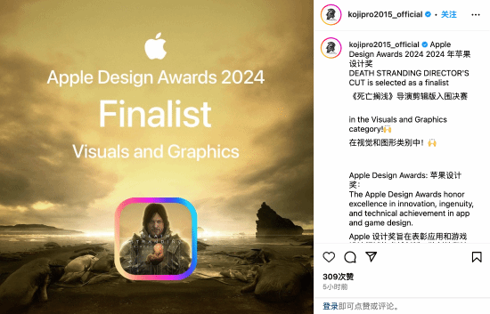 据了解,游戏《死亡搁浅:导演剪辑版》将于今年登陆了苹果iPhone、iPad以及Mac平台,而该游戏也于近期获2024苹果设计奖提名,入围视觉效果和图形类别决赛,让我们一起来看看苹果对这款游戏画面方面的评价吧。