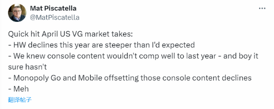 但是皮斯卡特拉在随后表示,与去年同期相比,美国于4月份在游戏机上的消费支出下降了43%。跌幅“比我预期的要大”,Mat Piscatella如此评价道。