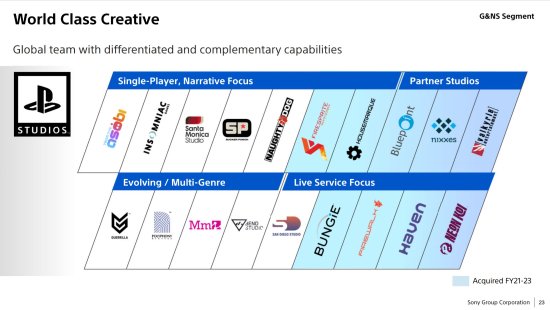 据了解,圣莫尼卡、Sucker Punch被归为“专注单人叙事”的工作室,此前被要求开发多人实时在线游戏的顽皮狗如今也被明确归为此类;而Bungie和San Diego Studio(《MLB》系列开发商)等工作室划入了实时服务型板块;除此之外还有“进化、多类型”这一品类,其中包括游骑兵和开发了《往日不再》的Bend。