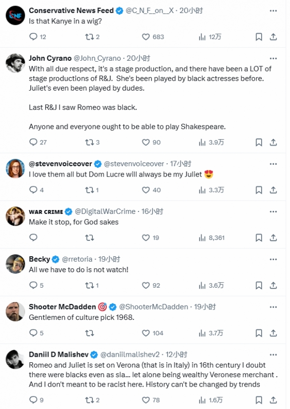 据悉,荷兰弟版《罗密欧与朱丽叶》自从公布以来就引发了一些争议,大量网友都指责由黑人演员Francesca Amewudah-Rivers饰演女主太过于荒唐。而值得一提的是,知名媒体THR还在剧场首演结束后发表评论,称荷兰弟的表演令人失望,但黑人女主表现出色。