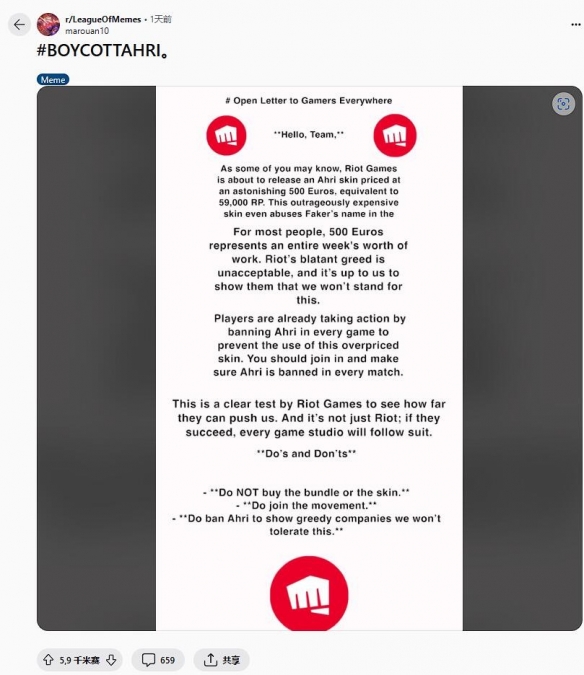 目前,已经有许多玩家纷纷加入“阿狸Reddit论坛”,发帖表示将与抵抗者站在一起,参与这场抵制运动。多张呼吁“Ban阿狸”的模因图已在X平台等多处开始流传。