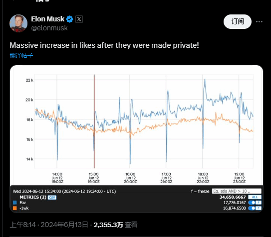 该更新上线后,马斯克发文表示,使用点赞功能的人数大幅提升,并晒出了相关数据。显然他对于新机制的改动感到十分满意。