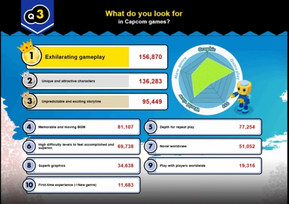 总共有超过25.4万人参加了卡普空的调查,当被问到“你最欣赏卡普空游戏的哪一点”时,“令人上瘾的游戏玩法”以15.6万的票数排名第一,“独特而有吸引力的角色”13.6万票排名第二,“出人意料、精彩刺激的剧情”9.5万票排名第三。