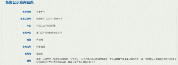 本期小编根据国家电影局关于2024年5月上全国电影剧本(梗概)备案、立项公示的通知,电影《开端之送不到的快递》备案立项,备案单位为厦门正午阳光影视有限公司,编剧为何碧娴(剧版《开端》编剧,笔名祈祷君)。详细内容我们就一起往下看看吧。