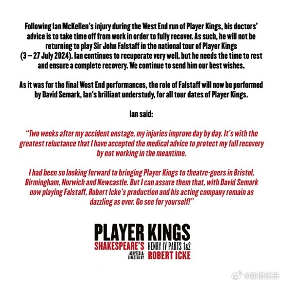 据相关消息,《指环王》甘道夫饰演者伊恩·麦克莱恩于上月18日在话剧表演时不慎从舞台上跌落,随后剧组在社交平台上发文表示,虽然伊恩·麦克莱恩恢复得很好,但这段时间需要暂停工作,静养至完全康复,让我们一起来看看吧。