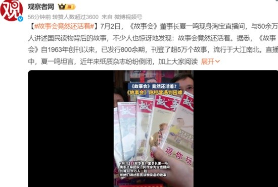 据了解,《故事会》自1963年创刊以来,已发行800余期,刊登了超5万个故事,流行于大江南北,而据相关消息,《故事会》董事长夏一鸣于7月2日现身淘宝直播间,与50余万人讲述国民读物背后的故事,不少人也惊讶地发现:故事会竟然还活着。