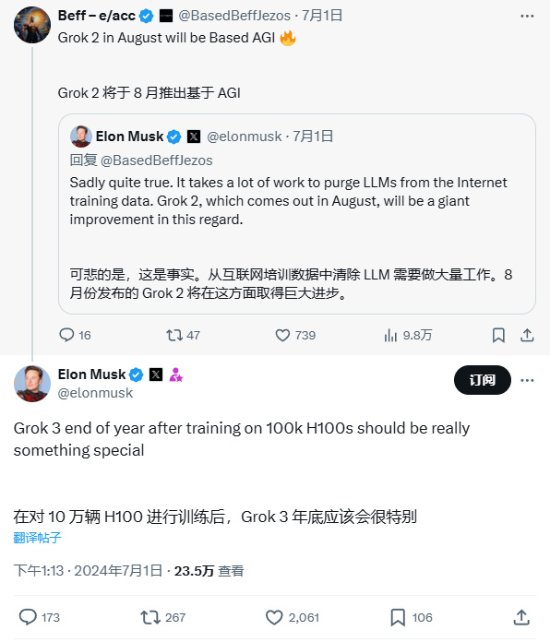 他透露xAI的Grok-3用了10万块英伟达H100芯片进行训练,预计将于年底发布,相信它会“非常特别”。