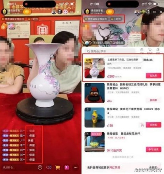 上述吹捧发生在某瓷器文玩直播间。主播多次暗示藏品价值高昂、有许多名人权贵求取不得,现在因为情义分享给家人们,不能做到保密的就不要拍。随后,“保密”“格局”“情义”等弹幕滚动刷屏。