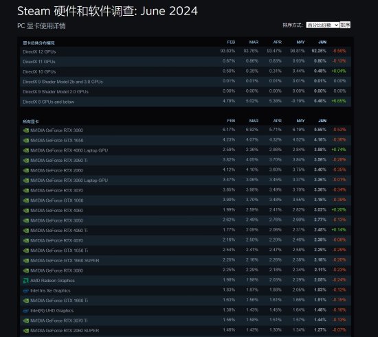 据相关消息,最新一期Steam硬件调查已于近日正式被公布,在本次调查的显卡榜中,搭载在游戏本上的RTX 4060M的占比从5月份的2.84%上升到6月份的3.58%,成为Steam玩家使用的最多的40系显卡,而上代的性价比甜品卡RTX 3060占有率有所下滑,但依旧占据榜首,让我们一起来看看本次调查的具体数据吧。